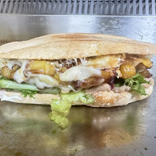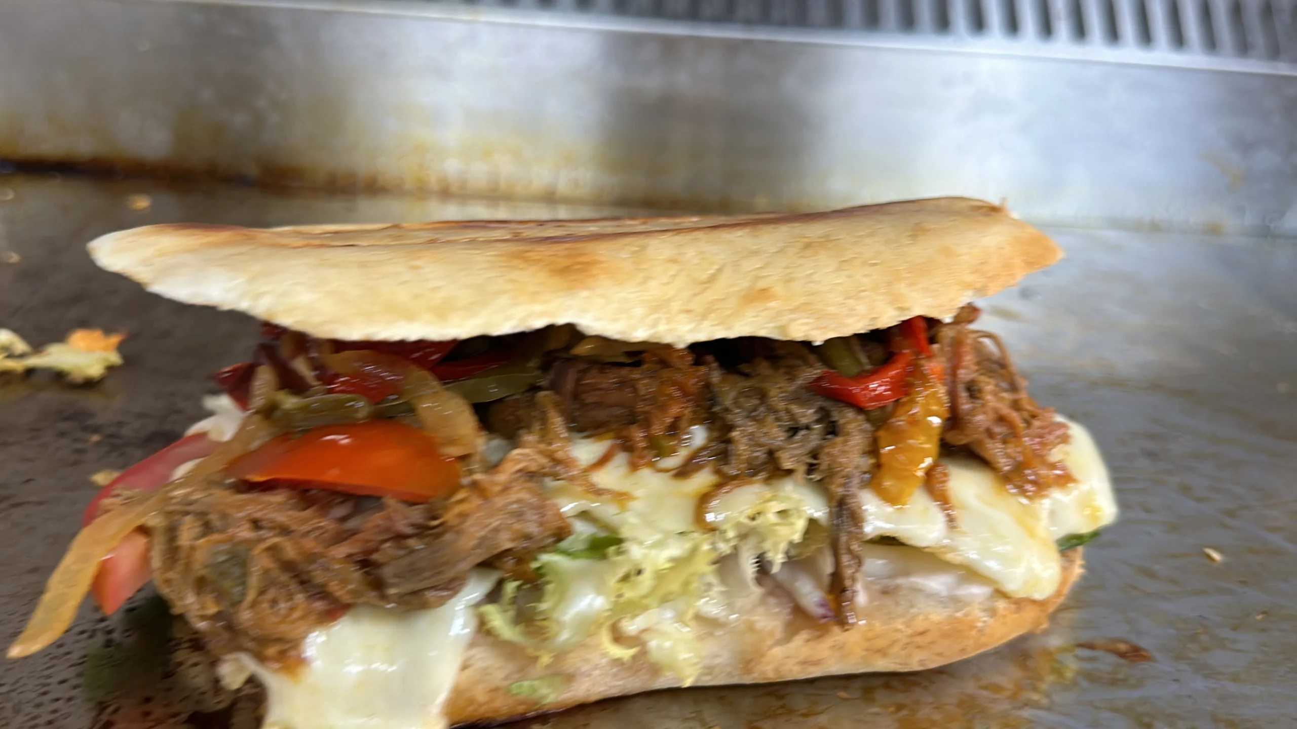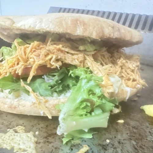 PAN BOLILLO – FRIJOL REFRITO – MAYONESA – LECHUGA – TOMATE – QUESO – CARNE DE TERNERA DESHILACHADA Y GUISADA CON PIMIENTO Y CEBOLLA – CON SALSA DE AJO